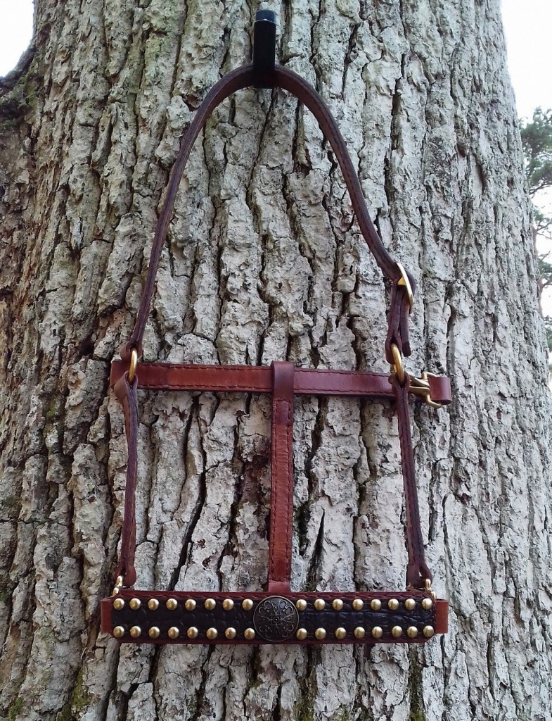 Håndlaget lærgrime. Mellombrunt lær, belagt med mørkebrunt, preget skinn. Justerbar nakke- og nesereim. Håndsøm.