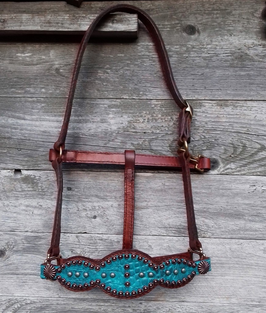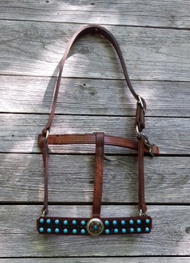 Håndlaget lærgrime. Mellombrunt lær, belagt med turkisfarget, preget skinn. Ringer og spenner i messing. Pyntedetaljer i antikk kobber. Justerbar nakke- og nesereim. Håndsøm.