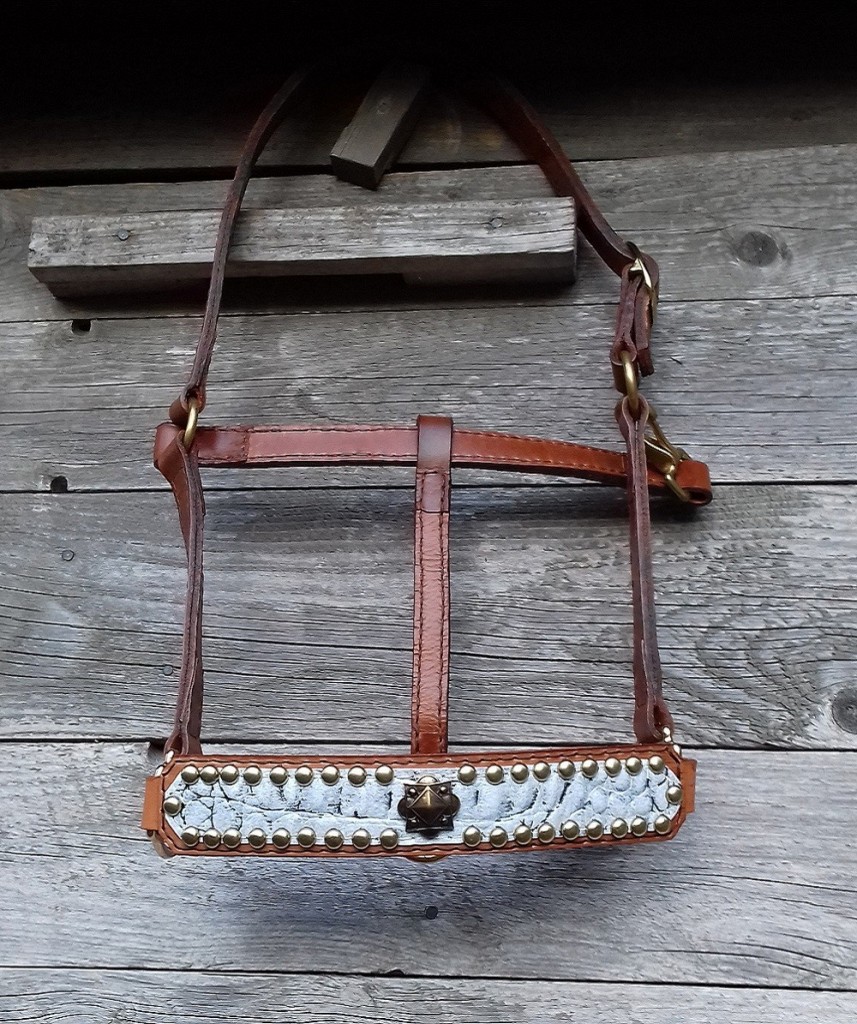 Håndlaget lærgrime. Mellombrunt lær, belagt med hvitt, preget skinn. Ringer og spenner i messing. Pyntedetaljer i antikk messing/messing. Justerbar nakke- og nesereim. Håndsøm.